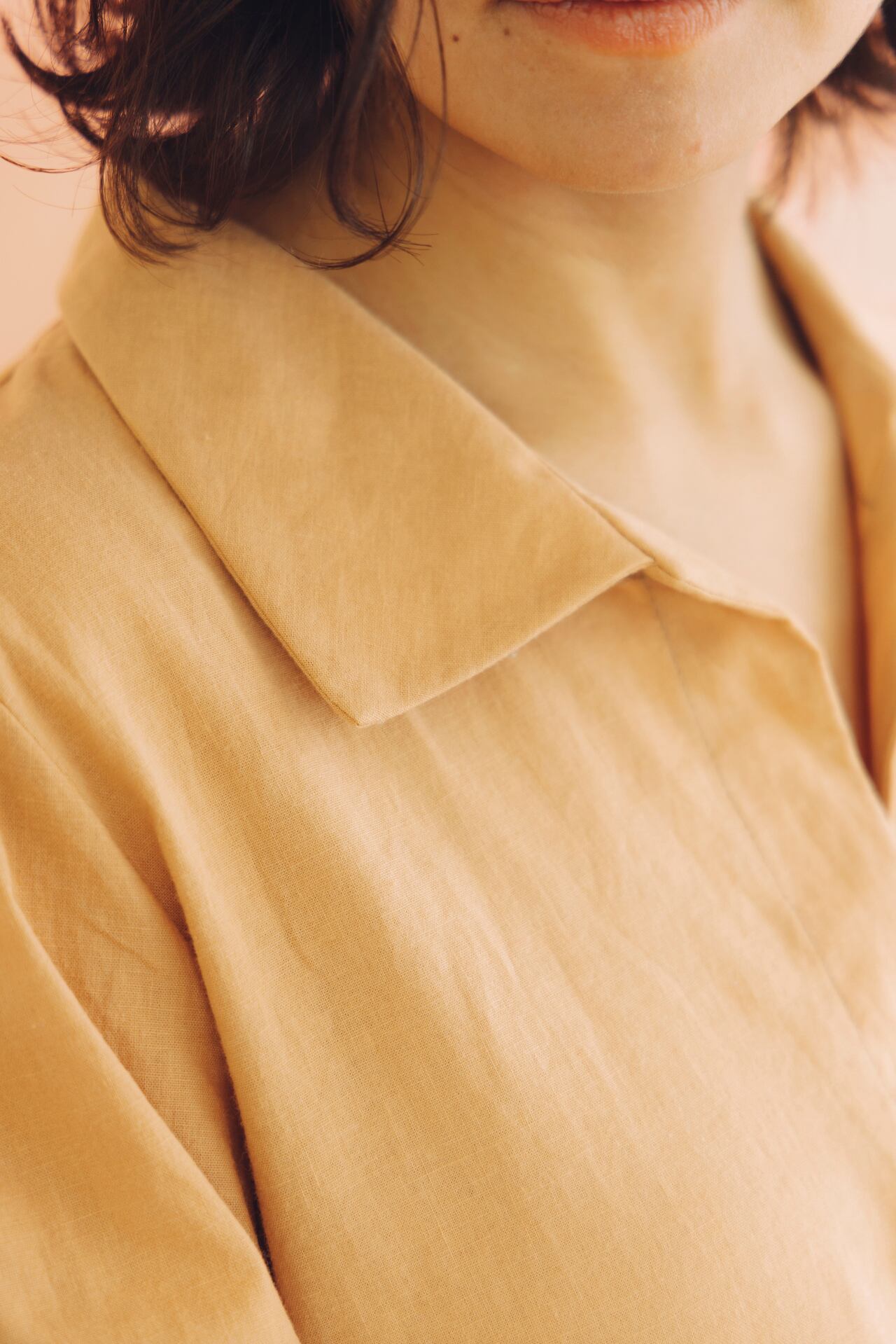 コットンリネン袖ギャザー襟付きワンピースのボトムスに、麻100%素材を天然染した素材で仕上げたリラックスパンツです。裾にゴムを緩めに入れておりますので足元の動きを邪魔せず、程よいスリム感でシルエットの美しさも保ちます。同じペールカラーでセットアップのように楽しめるコーディネートです。
