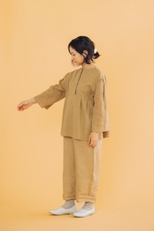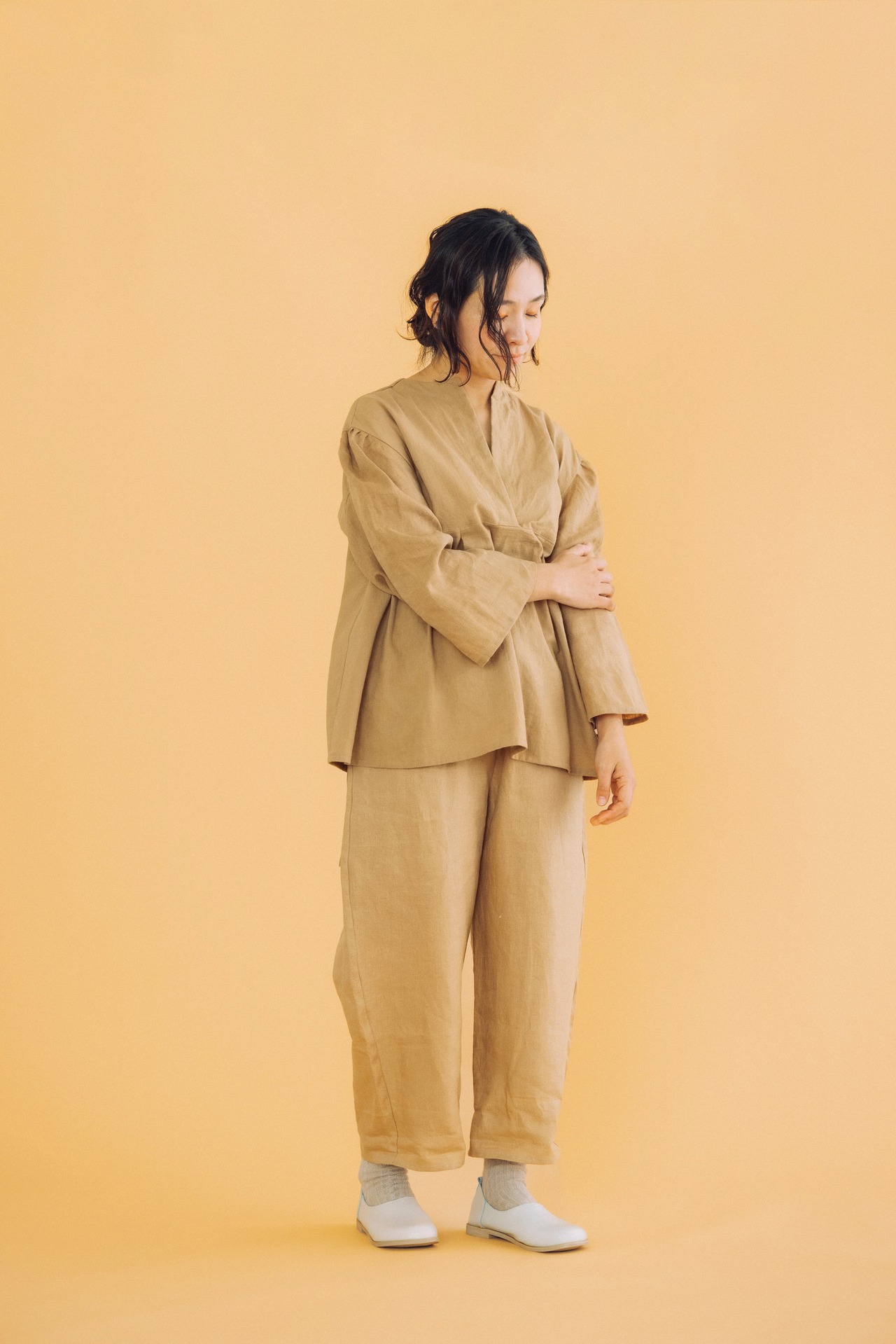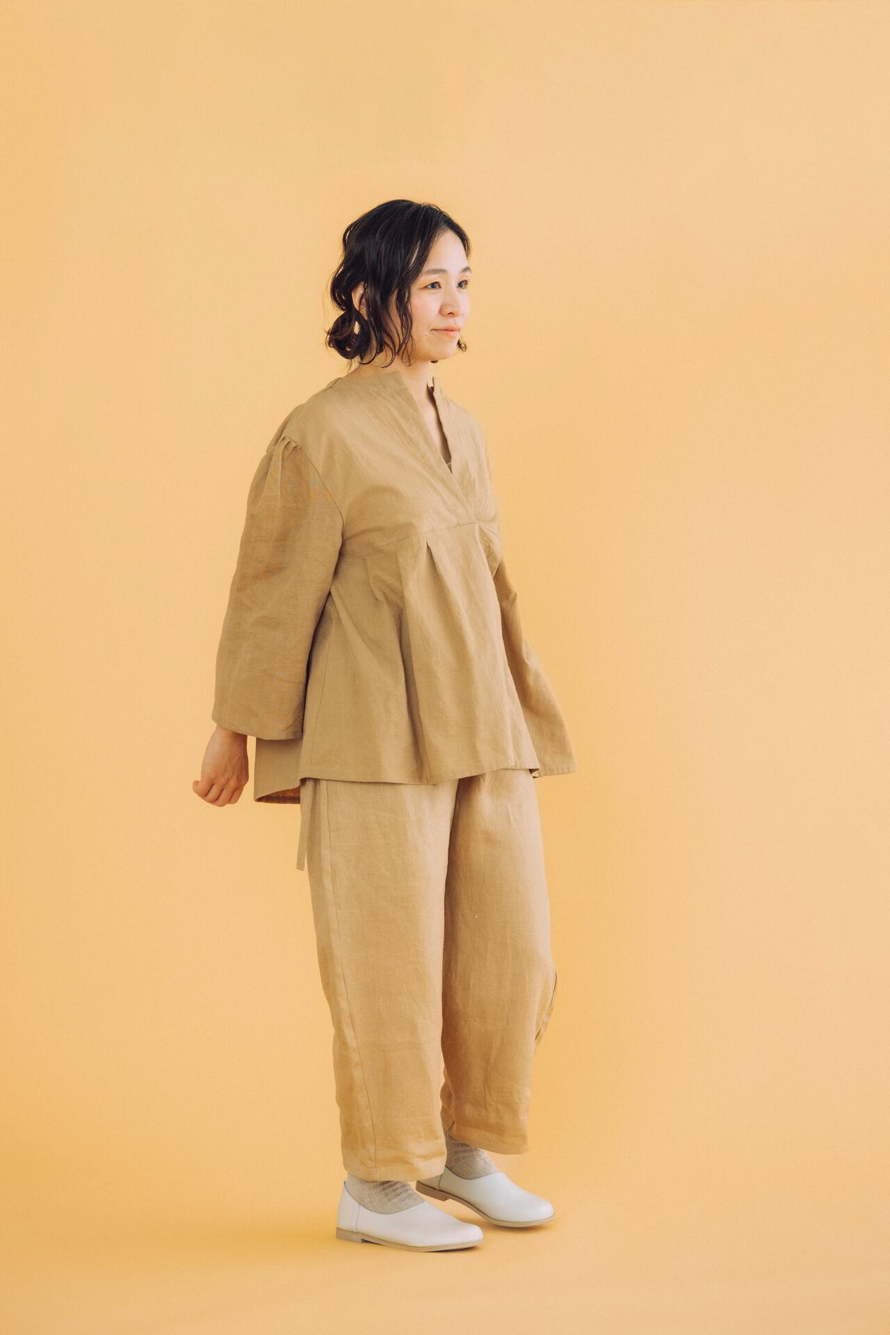 バストラインで切り替えて下部にタッグが入っています。胸元も大きく開きがあるのでかぶりで着用が楽ちんかつ、袖幅もあるので肩周りもリラックスして着用いただけます。