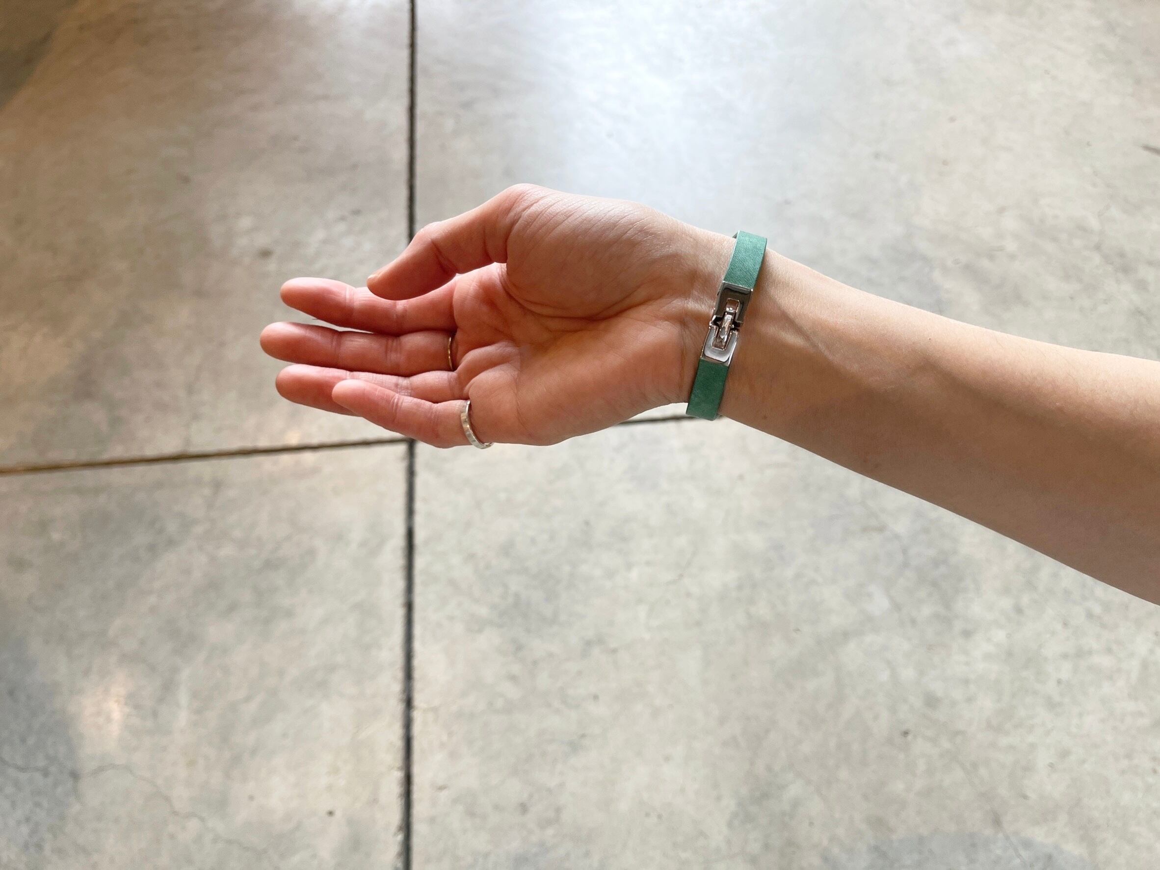 片面に波打つようなラインを、片面はストレートラインで回すと2wayで楽しめるデザインとなっております。幅10mmでほっそりと、また銀色の金具がファッションアイテムとして光ります。